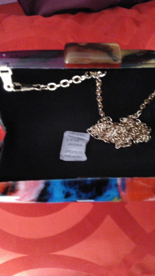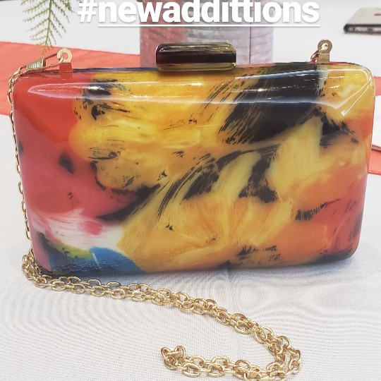 Description  Acrylic; Polyester Fabric Lining Crossbody Metal Strap Imported Dimensions 4.17″ H, 7″ W, 1.96″ D 10.6 cm. H, 18 cm. W, 5 cm. D