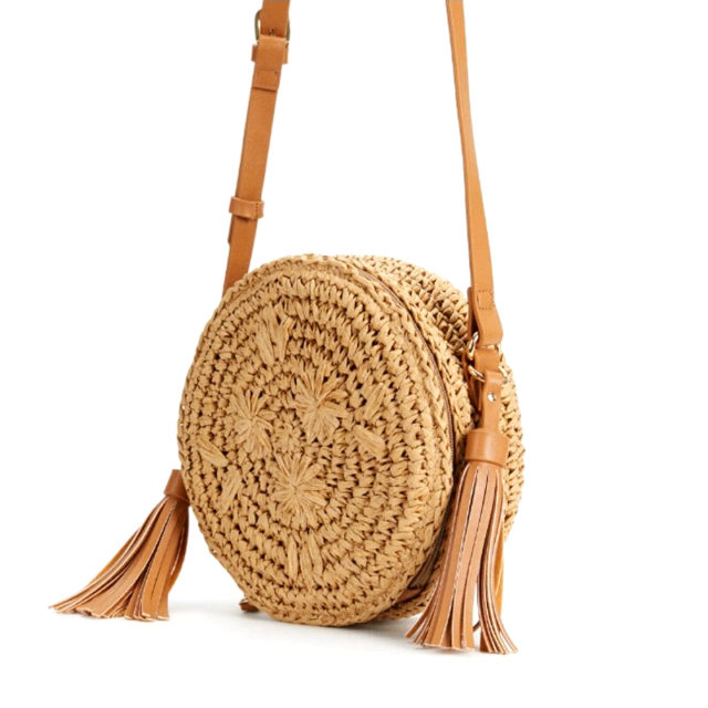 Round Woven Cane Bag with Crossbody Strap