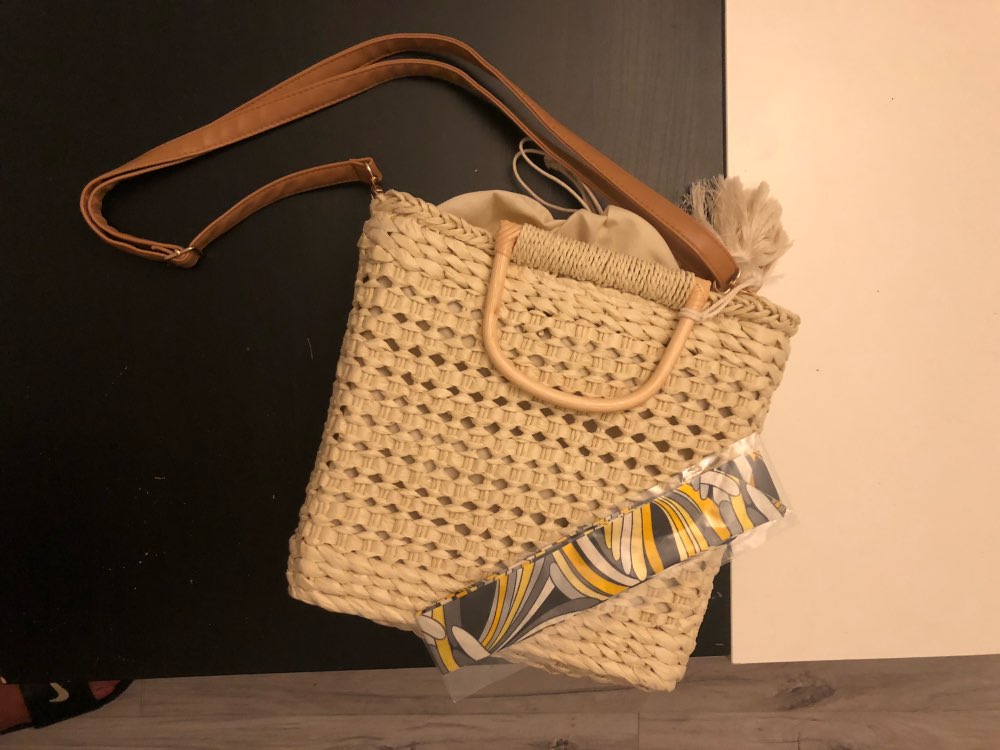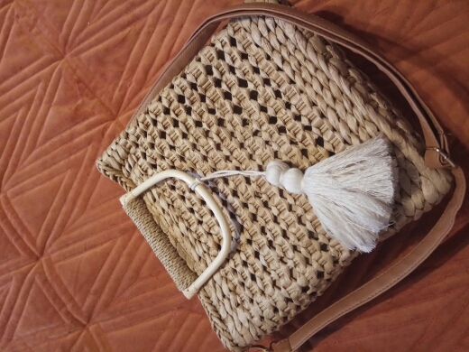 The bag is cute-for the money, it looks original. Delivery is very fast to USA. The material is similar to rafia. In the photo it seems that the bag has a rigid shape, in fact it is soft, the shape does not hold, so the bag looks bigger, I expected that the bag will be smaller. The bag tied on top is made of cloth reminiscent of dust for bags, i did not really like it. The strap looks cheap, i will think what to replace it, you can wear it without a strap. In principle, the bag corresponds to all characteristics and photos.