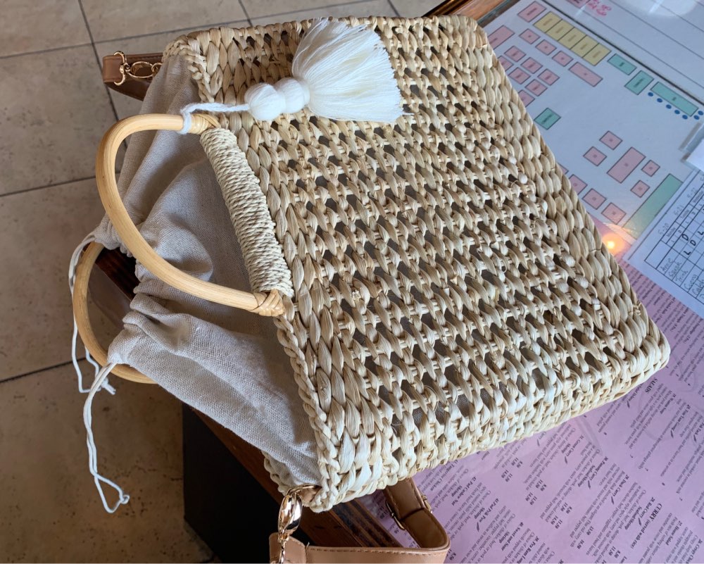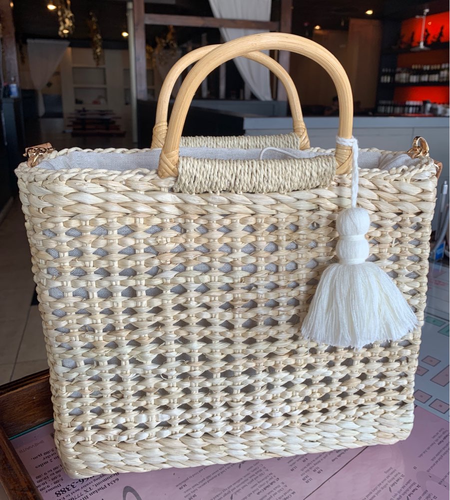 Description  Hand woven straw Wooden handle PU crossbody strap Fully lined Imported Dimensions 10.23″ H, 11.81″ W, 3.93″ D. 26 cm. H, 30 cm. W, 10 cm D.