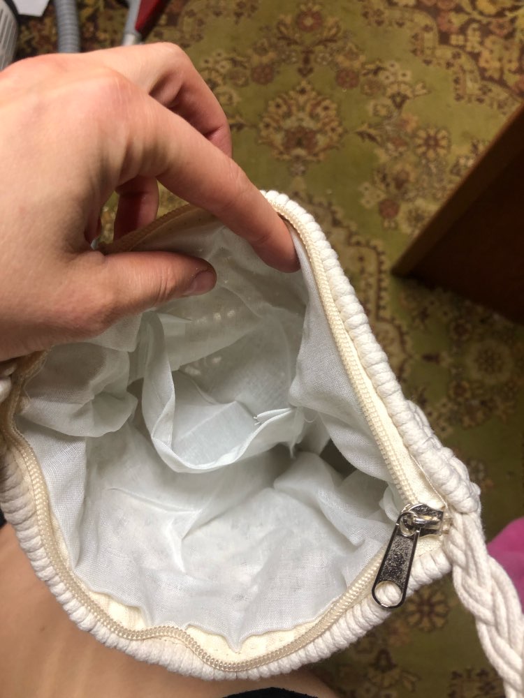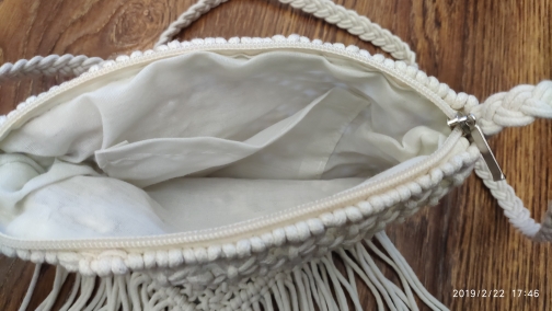 The bag is literal, woven from threads. Inside fabric lining. Top fastens with a zipper. Suitable as an addition to a light summer dress.