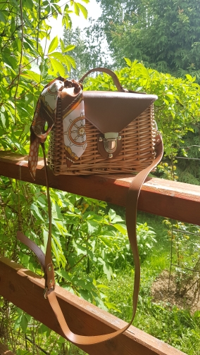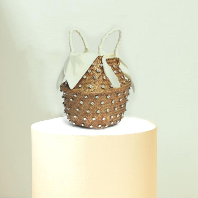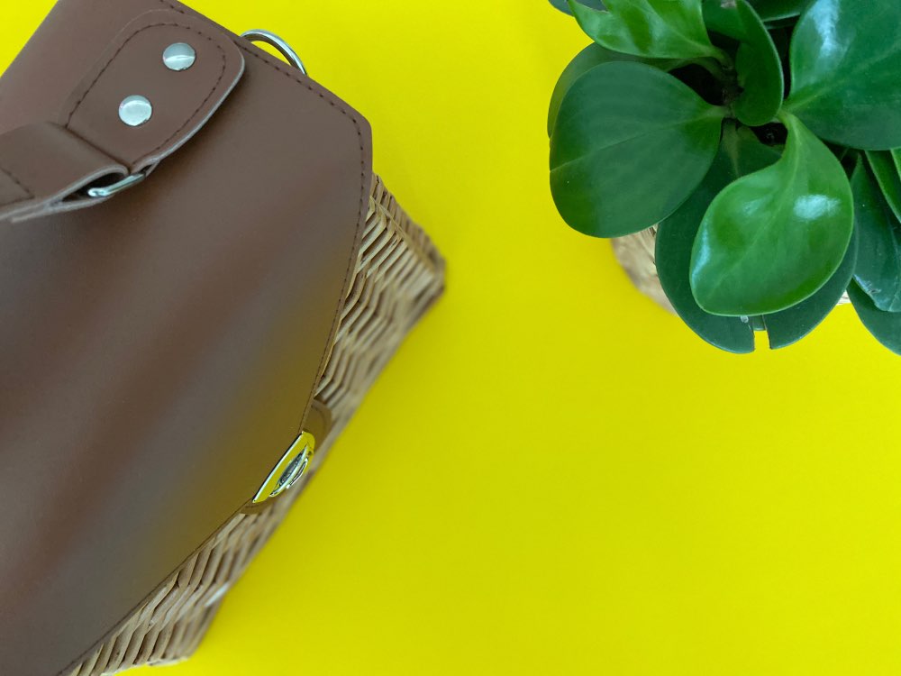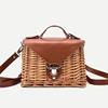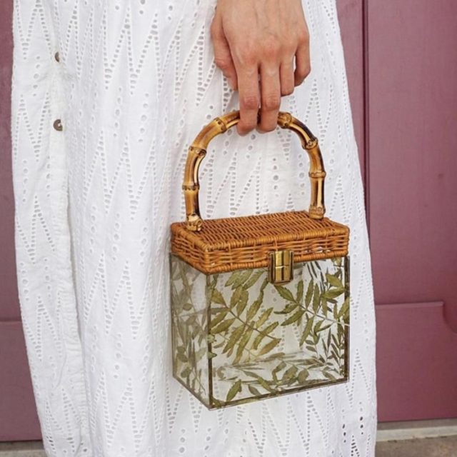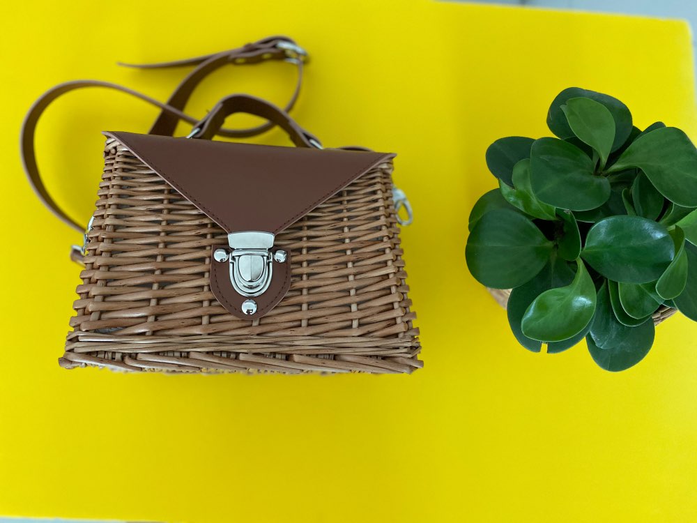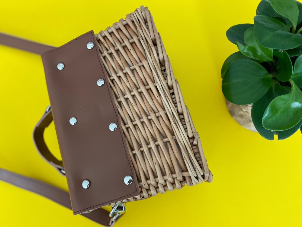 Description  Rattan; Polyester lining; Faux Leather Crossbody chain strap Push lock closure Imported Dimensions 3.54″ H, 8.66″ W. 16 cm. H, 22 cm. W.