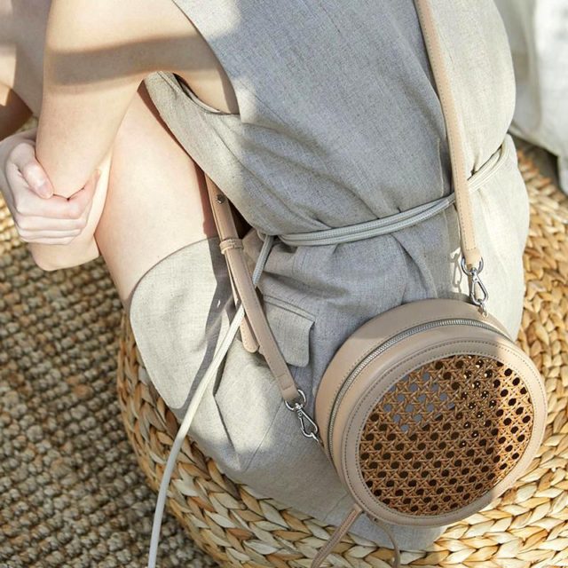 Round Woven Cane Bag with Crossbody Strap